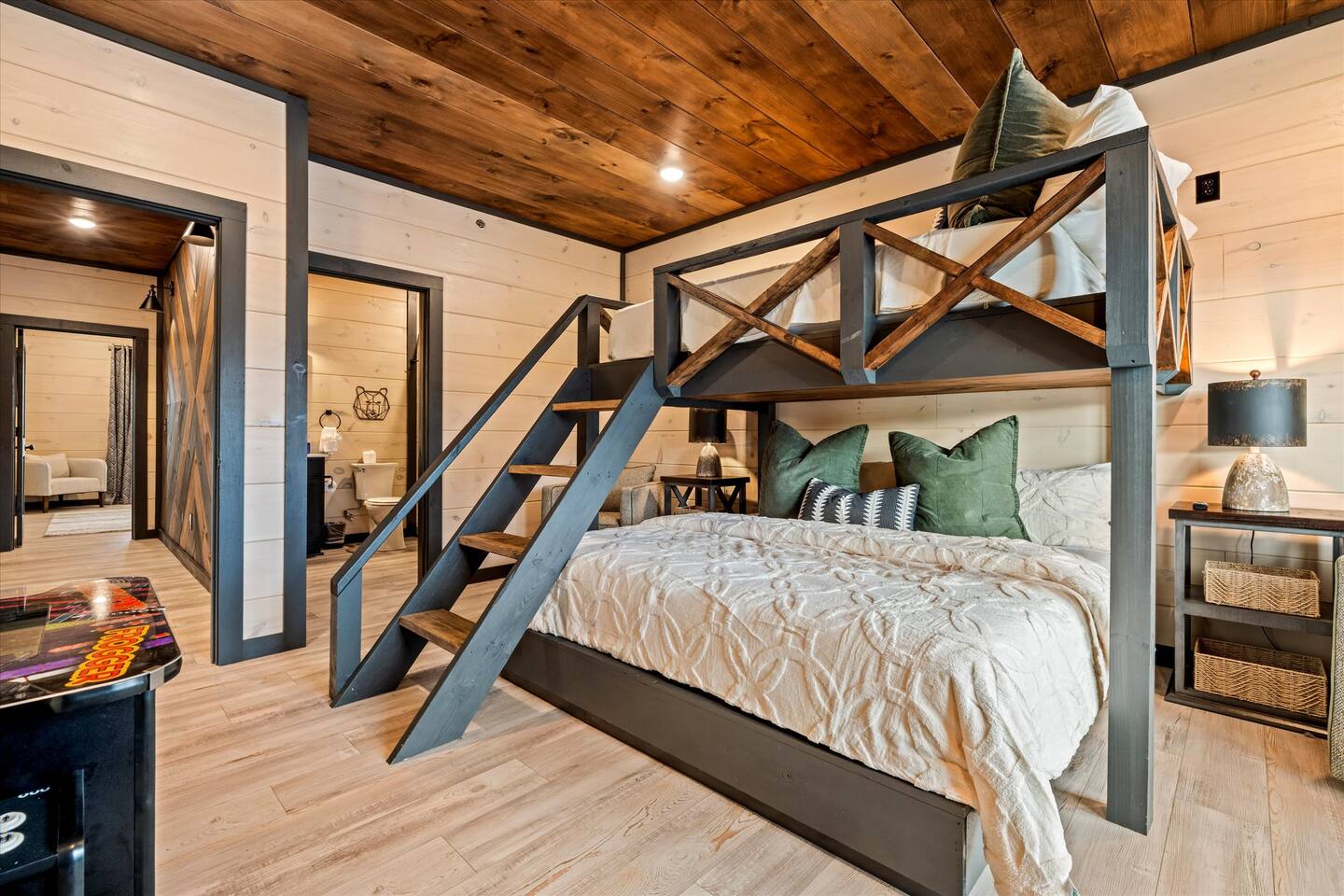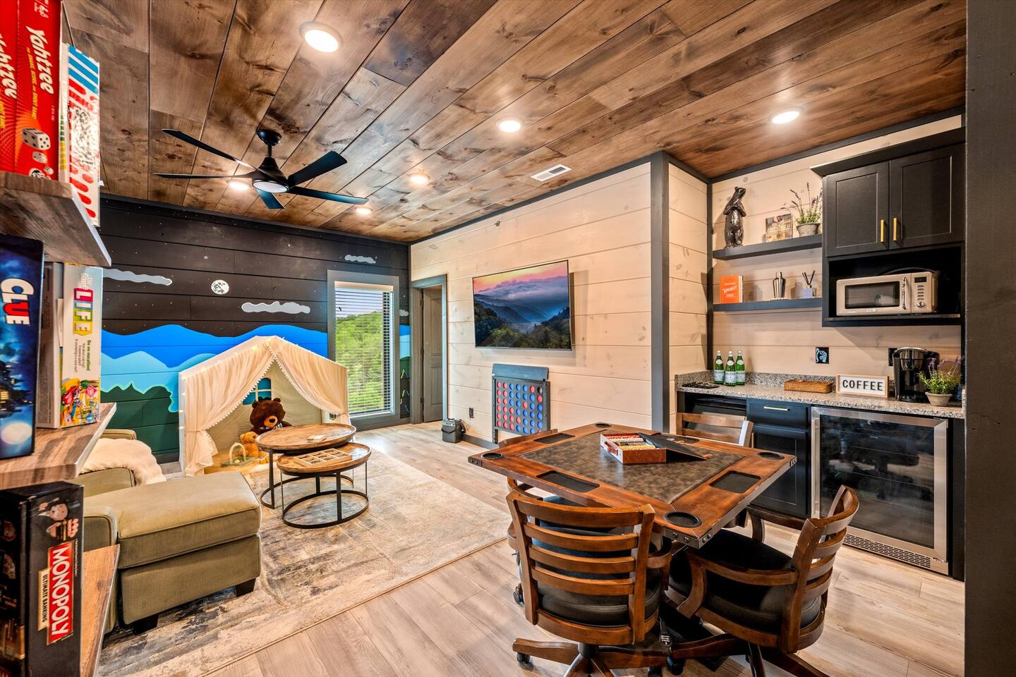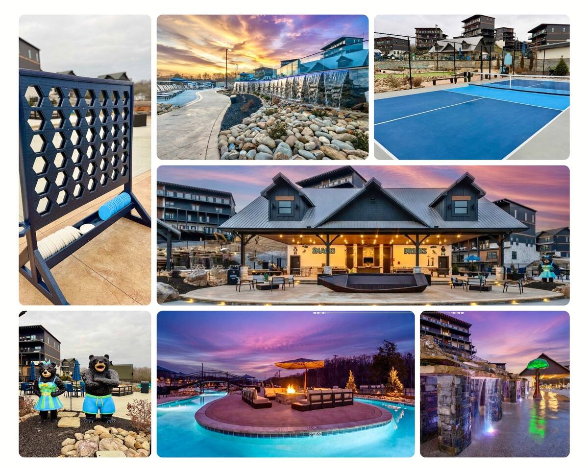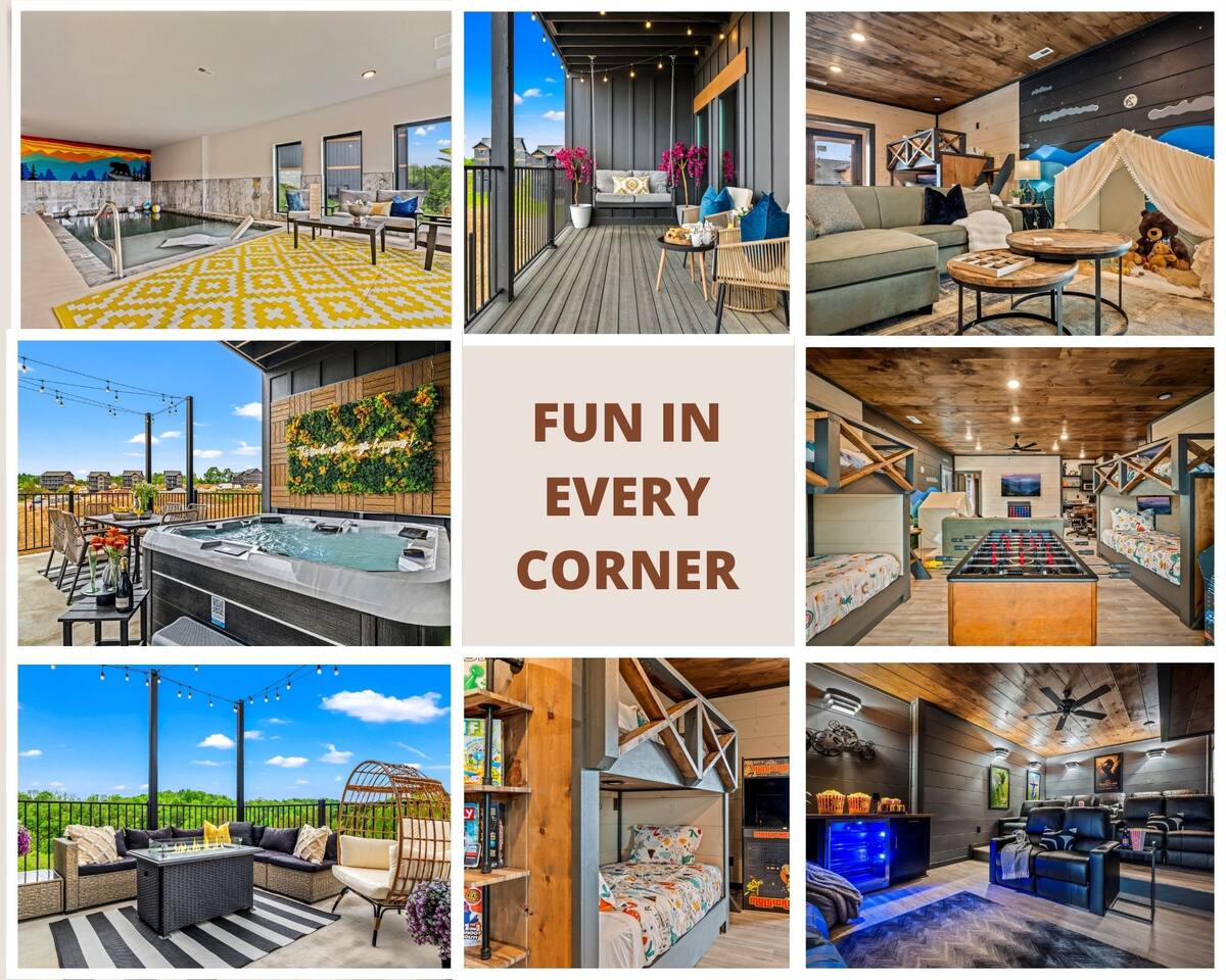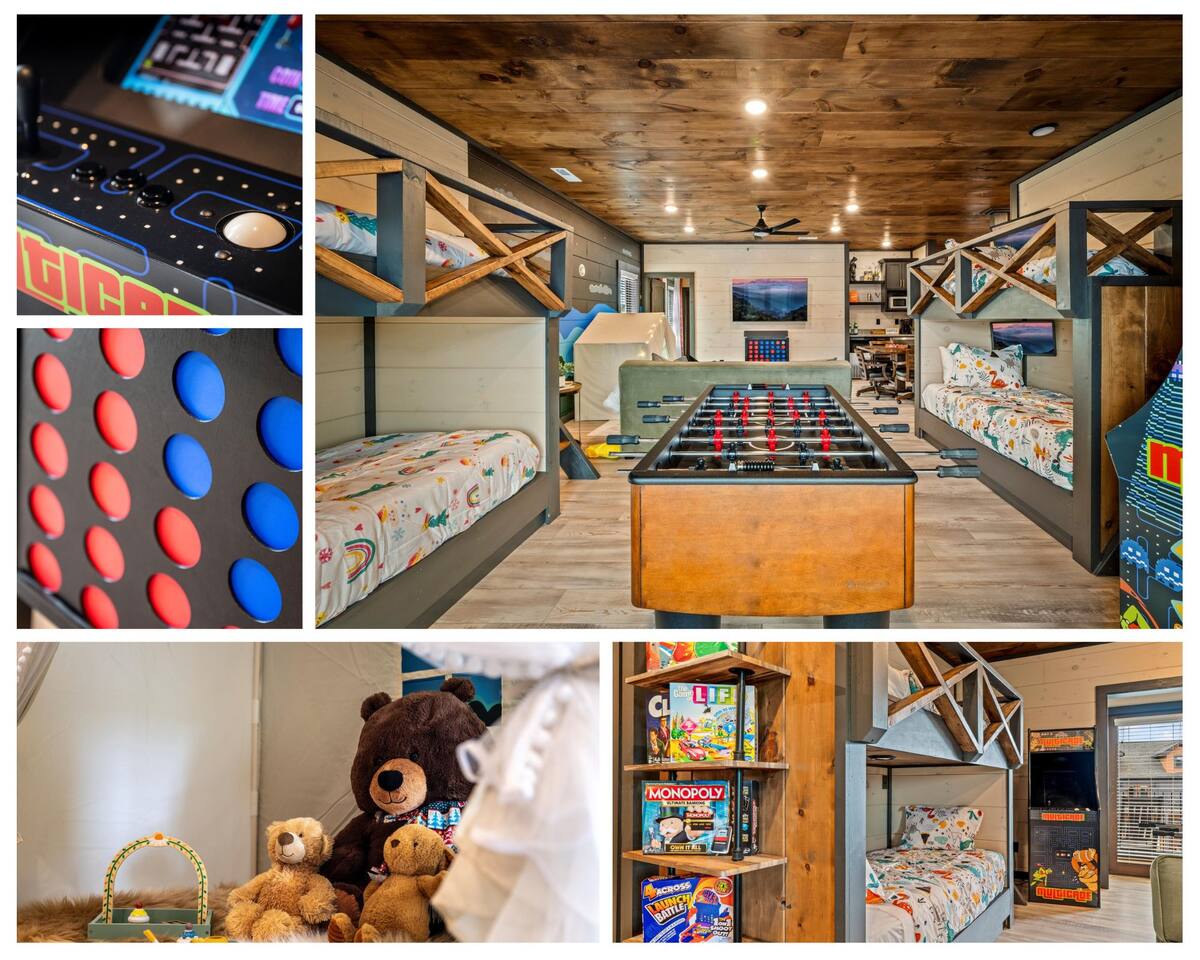 Skip the Pigeon Forge traffic—we are only 1 mile from the Parkway! Paved, flat roads (no scary mountain driving) leading to a private resort paradise. 🌟Why Guests LOVE Kettle Knot Retreat🌟 ✅ No steep roads – smooth, flat, paved access ✅ FREE resort waterpark access (lazy river, infinity pool, mini golf & more) ✅ 6 Meticulously Designed Spacious Ensuite Bedrooms (Smart TVs in every room), Bunk room - sleeps 22 comfortably ✅ Private Indoor Pool & Hot Tub (heated to 82 degrees year-round) ✅ Ultimate Game Room – arcades, poker, karaoke, Foosball, dedicated movie theater, a kids' play zone with Teepee, ensuring entertainment for all ages without leaving the property. ✅ Toddler-friendly amenities – bassinet, high chair, baby gates, safe layout ✅ Movie Theater – 85” screen + Sonos surround sound ✅ Fully Stocked Kitchen – Instapot, air fryer, blender, dual coffee maker ✅ Tastefully designed outdoor patio spaces with Smoky Mountain Views + grills (gas & charcoal) ✅ 1 Mile to The Parkway – Minutes from Dollywood, The Island, and Pigeon Forge attractions 🛏️ Bedroom Layout & Sleeping Arrangements (Sleeps 22): Each bedroom is spacious, ensuite, and equipped with a Smart TV. ✔ Bedroom 1 – King Bed, TV, Ensuite Bathroom ✔ Bedroom 2 – King Bed, Futon, TV, Ensuite Bathroom ✔ Bedroom 3 – King Bed, TV, Ensuite Bathroom ✔ Bedroom 4 – Queen-over-King Bunk, TV, Ensuite Bathroom, Arcade Games ✔ Bedroom 5 – Queen Bed, TV, Ensuite Bathroom ✔ Bedroom 6 – King Bed, TV, Ensuite Bathroom ✔ Game Room – 2 Twin Bunk Sets w/ Private TVs, Pull-Out Sofa, Large TV, Bathroom with bath tub. ✔ Smart TVs in Every Room – Ready to log into your Netflix & chill ready 🍳 Fully Equipped Kitchen • Granite countertops, stainless steel appliances • Instapot, air fryer, blender, baking pans • Dual coffee maker (K-Cup & drip) + ice machine • Dining for 17 at the table + extra seating at island & bar 🏞 Outdoor Living ✅ Mountain-view patios with seating & grills (Gas grill (propane included), charcoal grill (BOY charcoal) ✅ Hot tub - Soak under the stars or watch the sunrise ✅ Outdoor dining and lounge area across multiple patios. 💦 Private Indoor Pool & Outdoor Hot Tub: ✅ Indoor Pool – 20' x 12', heated to 82°F year-round (3.5 ft deep) ✅ 10 Pool towels provided in addition to the bath towels 🧳 Resort Amenities at Smith Creek Reserve: [Nov-Feb]All water features will be closed, while others will remain open depending on weather conditions. Waterpark fully operational from March 1st onwards. ✅ Lazy River & Infinity Pool ✅ Outdoor Movie Theater & Cabanas ✅ Mini Golf, Pickle ball, Life-Size Games ✅ Large Hot Tubs, Fire Pits, Snack Bar (to purchase) 🎯 Location Highlights: • 1 Mile to The Parkway (No steep roads!) • 3 Miles to The Island in Pigeon Forge • 6 Miles to Dollywood • 12 Miles to Gatlinburg & Great Smoky Mountains National Park 🎮 In-Cabin Entertainment: ✅ 3 Multi-cade arcade machines ✅ Foosball, poker table ✅ Movie theater with 85" TV & Sonos surround sound ✅ Loft game room, board games, Smart TVs, and more 👶 Kid & Baby Friendly: ✅ Bassinet, high chair, baby gates on 2nd & 3rd floors ✅ Kid-friendly bunk area with dedicated bath ✅ Huge safe indoor areas for play 📍 Enjoy brand new resort amenities at a discounted rate while our neighboring community finishes its final touches. The cabin is highly insulated for a peaceful stay!